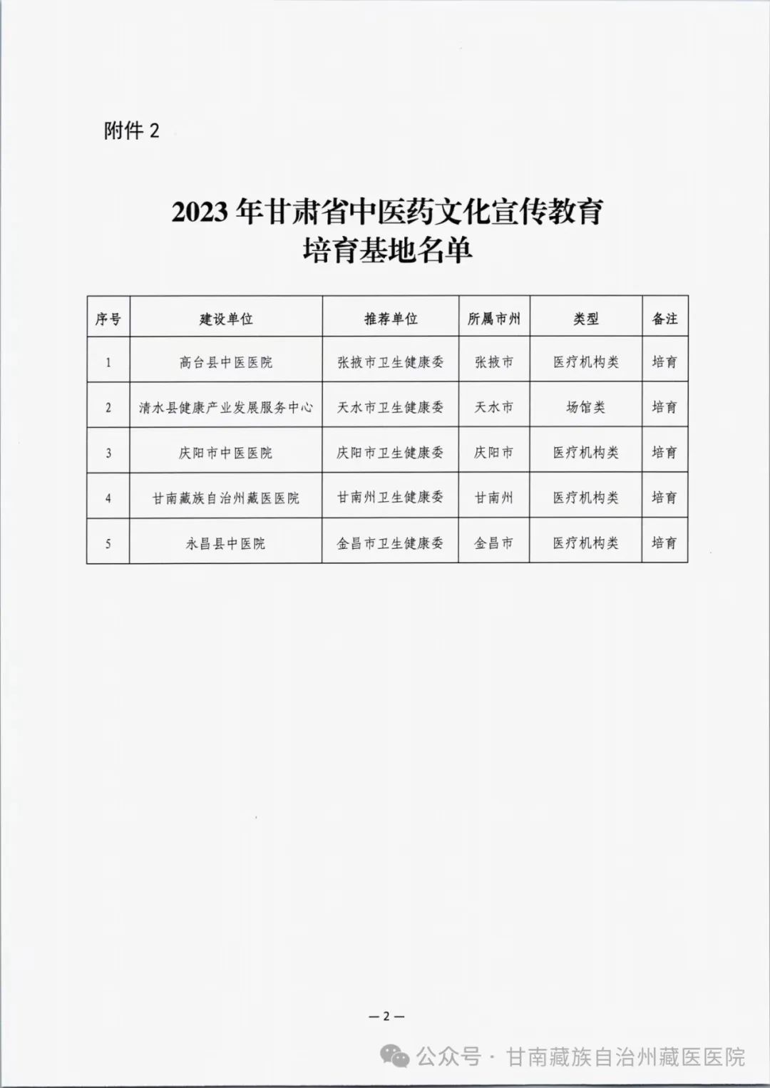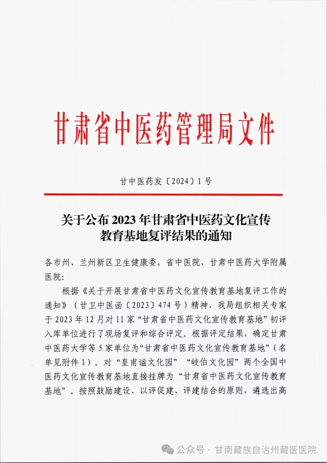 为传承和弘扬优秀中医药文化,促进我省中医药事业发展,根据甘肃省中医药管理局下发的申报要求,我院经单位申报、州级推荐、现场评估、专家评审等程序,成功被评定为2023年甘肃省第一批中医药文化宣传教育培育基地。
