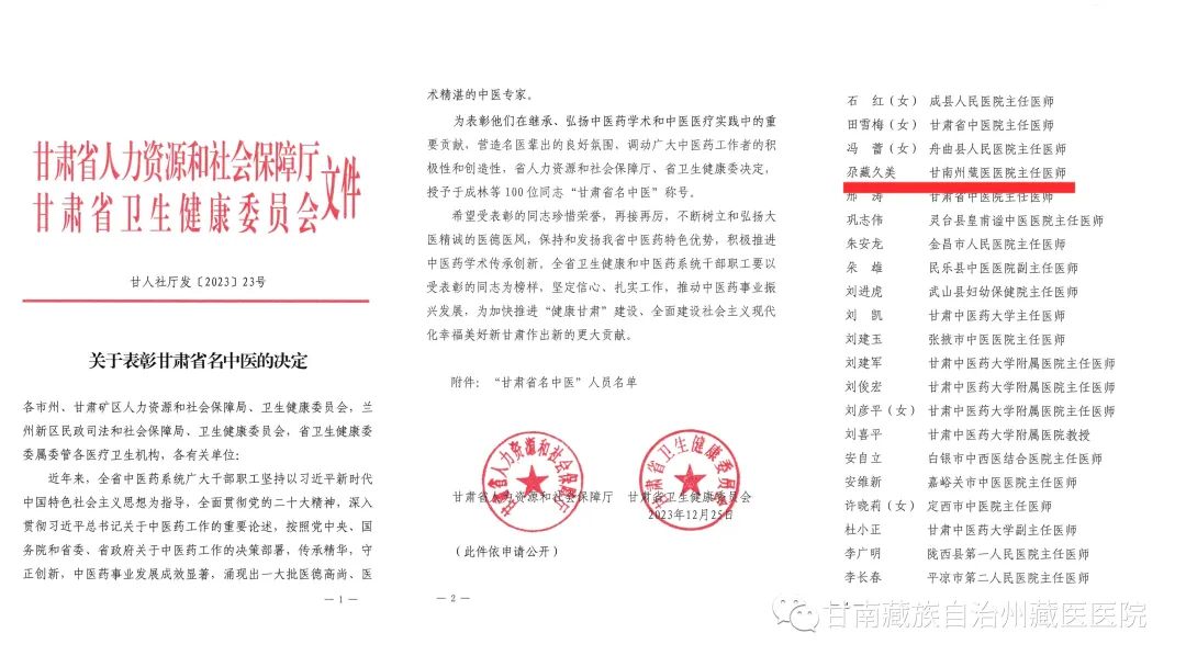 近日,甘肃省人力资源和社会保障厅、甘肃省卫生健康委印发《关于表彰甘肃省名中医的决定》,授予于成林等100名同志“甘肃省名中医”荣誉称号。 我院胃病专科藏医主任医师尕藏久美榜上有名,荣获“甘肃省名中医”荣誉称号。尕藏久美,甘南州藏医医院藏医主任医师,师从西热加措、图布旦、慈智木、加洋尼玛、旦科、旦增扎西、贡觉旺堆、嘎务多吉、当增等国内知名藏医药专家教授。遵照″守正创新"的思路,不断汲取学术精华刻苦钻研学习藏西医理论,积极参加各类业务学习和学术研讨会,并将理论知识和临床经验有机结合。在继承的基础上加以发展,在临床中不断实践,形成了自己独特的治法。在消化系统疾病的治疗上积累了丰富的经验,用药独。他曾先后担任国家中医药管理局重点专科藏医胃病专科学术带头人,国家级藏医治未病学科带头人,省级重点专科藏医外治专科学科带头人,甘肃省五级师承指导老师;甘肃省中医药学会内科脾胃病专业委员会常务理事、甘肃省中医药学会肺病专业委员会常务理事、甘南州藏医药学会常务理事。主要从事藏医临床、教学、科研、管理工作,先后多次获得省、州、院内先进工作者、优秀医师等荣誉称号。