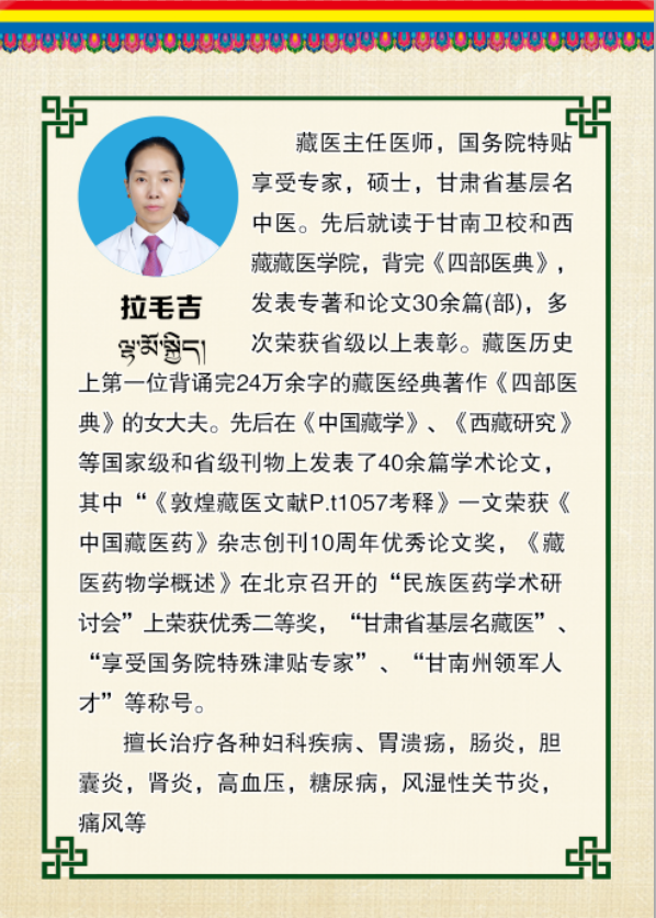 好消息  为进一步提升我院藏医药诊疗水平与科研能力,让广大患者享受到更专业、更优质的藏医药服务。我院通过柔性引进方式,特聘州内知名藏医专家——拉毛吉藏医主任医师,于每周五莅临我院门诊坐诊。