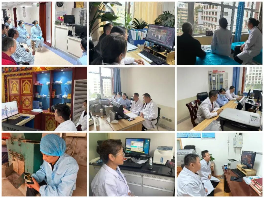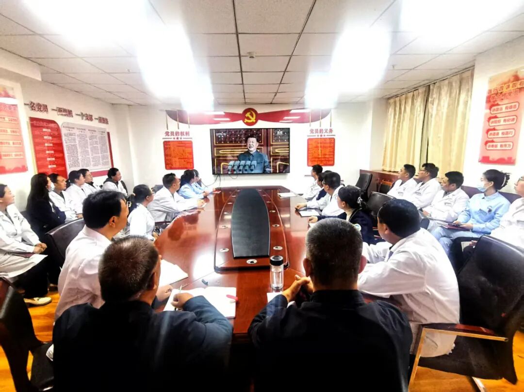 院领导班子与行政后勤人员在会议室集中观看,在岗医务人员通过电脑、手机等设备,在各自的工作岗位上认真观看,病房里的患者和医护人员也一同聚精会神地收看,制剂中心、医生办公室、药房等地,处处可见大家观看直播的身影。