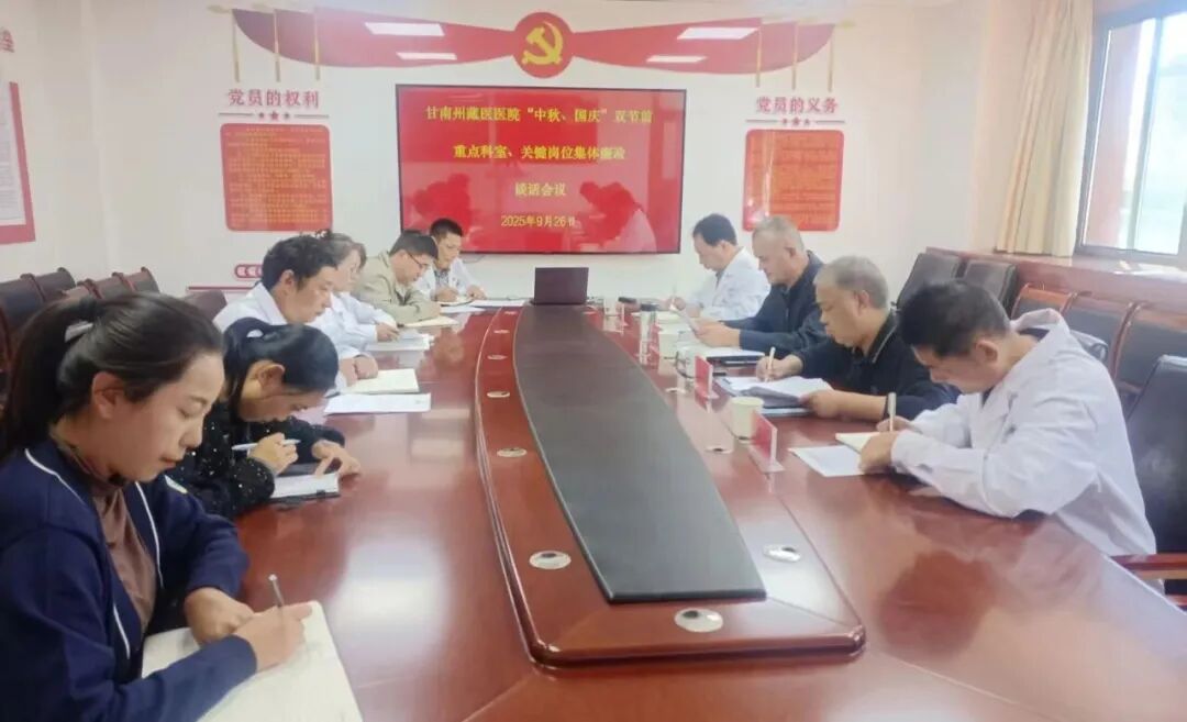 在中秋、国庆“双节”即将来临之际。9月26日,甘南州藏医医院召开“中秋、国庆”双节前重点科室、关键岗位集体廉政谈话专题会议。会议由党总支书记李盛森主持,院班子成员、行政办、财务科、总务科、药械科、制剂中心负责人及医保科全体人员参会。