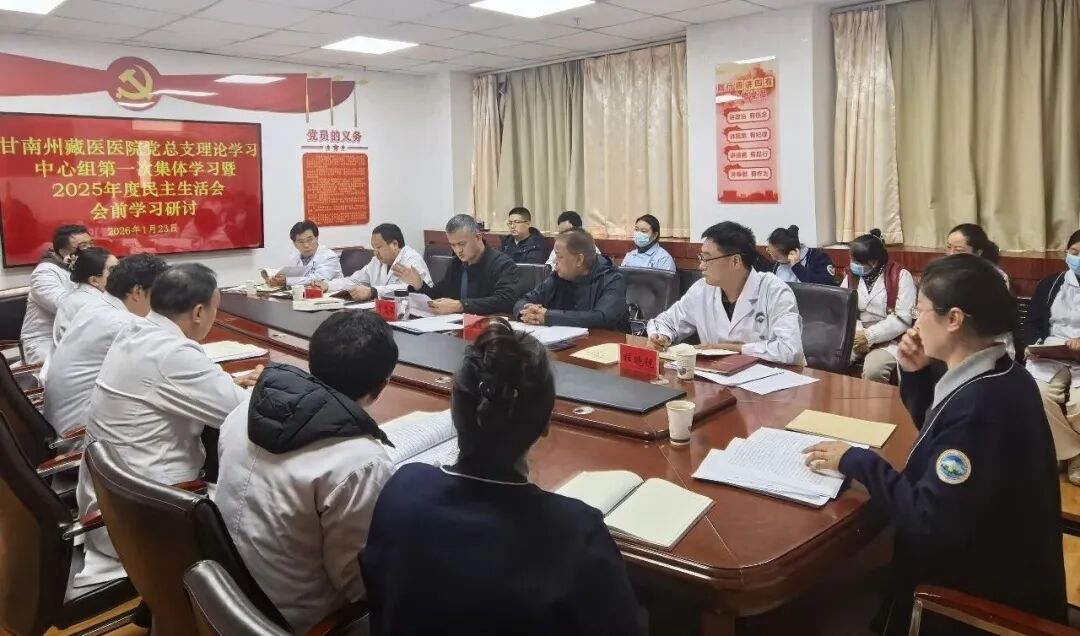1月23日,甘南州藏医院党总支召开理论学习中心组第一次集中学习暨2025年度民主生活会会前学习研讨会议。会议由党总支书记李盛森主持。院领导班子成员及各科室负责人参加。