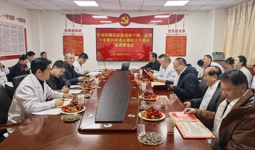岁末冬暖,情谊绵长。2月5日,甘南州藏医医院党总支召开退休干部、返聘老专家慰问座谈会,同步开展2025年度民主生活会征求意见工作。会议由院党总支书记李盛森主持。州卫生健康委员会党组成员、副主任王祖强应邀出席会议,院在家领导班子成员、中层干部及部分退休职工代表参加会议。